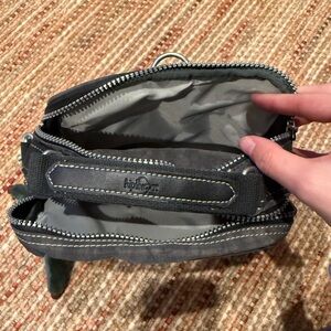 Compact Kipling belt bag in charcoal. Features front pocket and signature keychain.