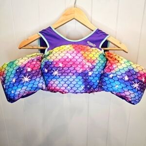 Vibrant mermaid scale design. Rainbow colors with star accents. Perfect for swimming.