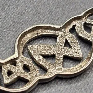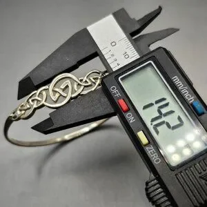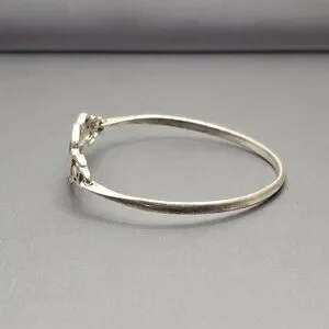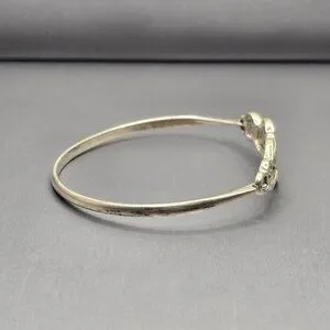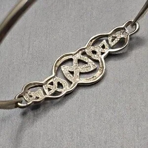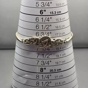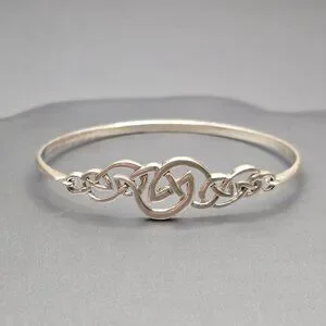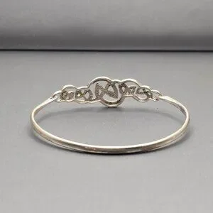 Vintage sterling silver bracelet featuring an intricate Celtic knot centerpiece symbolizing eternity and unity. Crafted in 925 silver and weighing 10.33 grams, this hinged design offers a secure fit for a 7 inch wrist. The textured finish and interwoven motif evoke artisan craftsmanship. Marked 925. A meaningful and elegant piece perfect for gifting or everyday wear.