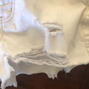 Used, good condition. High rise distressed shorts with frayed hem. Button fly. Measurements see pictures.