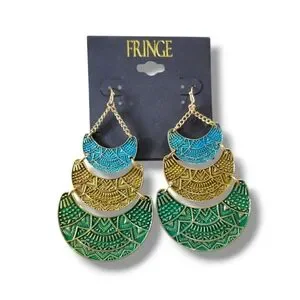 Fringe | Large Boho Embossed Gold Tone Blue/Green Layered Tribal Disc Earrings