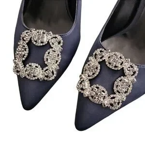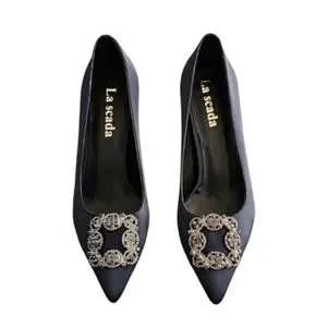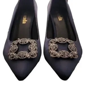 Pointy toes have a brooch of gunmetal color cz crystals.