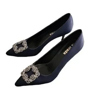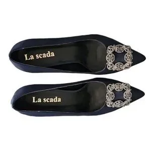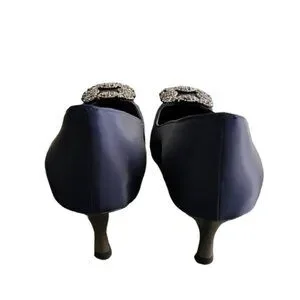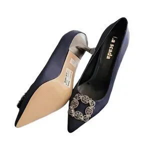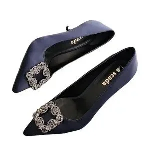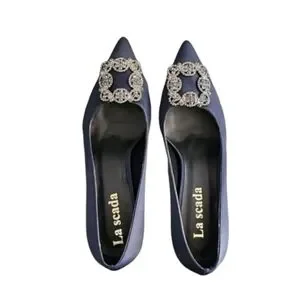 LA SCADA Navy Satin Pumps 37 7 Heels Jeweled Brooch Pointy Toe Euro Luxe
