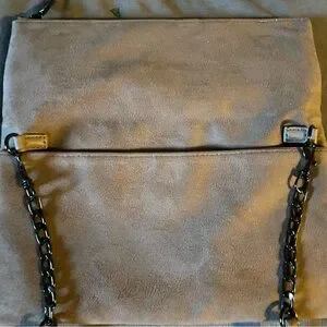 Material tag is missing. Exterior has a suede-like finish. Shoulder strap appears to be synthetic leather. Interior lining is satin-style fabric. Please refer to photos for finish and texture.