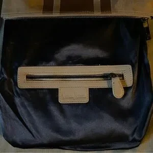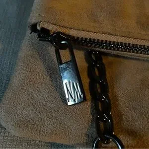 Tan suede-finish exterior with gold foil fabric accent panel on the front. Zip-top closure with magnetic snap underneath. Dark navy blue satin-style interior lining with one interior zip pocket. Silver-tone hardware.