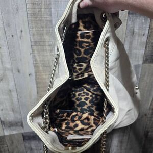 Details: shoulder straps, gold hardware, cheetah print lined inside, magnetic snap button closure, back zip pocket, very roomy