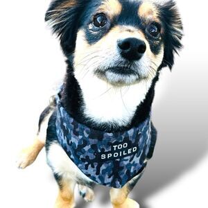 Spoiled in Camo offers a hand-curated Dog Bandana in a stylish black camo pattern with white embroidery that reads “TOO SPOILED.” This unique bandana features a snap button closure and a curved neckline for optimal comfort. Perfect for fashion-forward pups who deserve to stand out, Spoiled in Camo combines trendy design with practical functionality. Elevate your furry friend’s style with this exclusive accessory that is sure to turn heads during walks and playdates.
