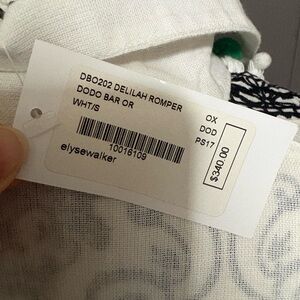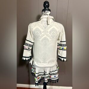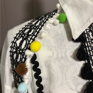 DODO BAR OR Delilah white and black embroidered romper with colorful pom pom accents.