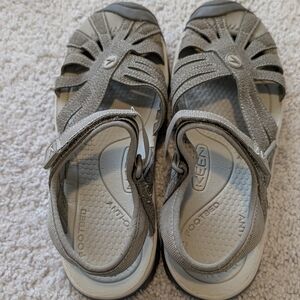 The KEEN Rose sandals in women's size 7.5 are perfect for hiking and other outdoor activities, with features such as arch support, cushioning, and a toe bumper for added protection. The sandals have a low heel height and a breathable design, making them suitable for summer, fall, and spring seasons. The brindle color and lightweight design make them versatile for both casual wear and activewear occasions. These sandals from the Keen Rose line are designed with a rubber outsole for non-slip performance and an adjustable strap for a comfortable fit.