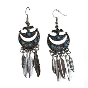 Boho Native American earrings crescent style faux turquoise silver colored feathers.