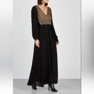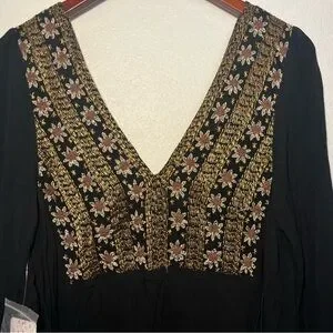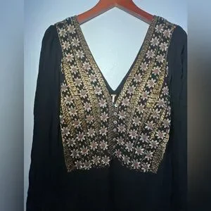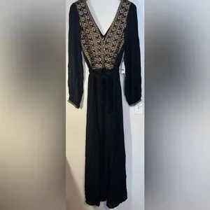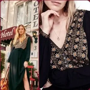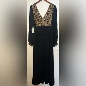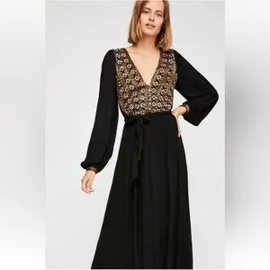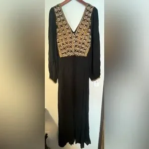 Elegant black maxi dress featuring intricate floral embroidery in stunning gold. It's perfect for a holiday party, or any other reason you have to celebrate! Rick your bohemian look!