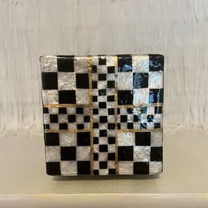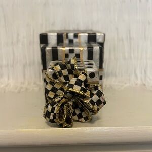 🖤🤍 The Courtly Capiz Gift Tower is stacked with MacKenzie-Childs style, featuring three packages decorated in hand-painted patterns and topped with Courtly Check® ribbon. Perfect for decking the tabletop or decorating the mantel.