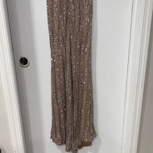 Dazzle in this stunning asymmetrical dress by Primavera Couture. Features shimmering bronze sequins. Ideal for glamorous events. Worn once, needs to be dry cleaned.