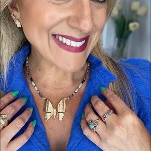 •Bold statement necklace centered around a matte golden butterfly pendant— symbolic of transformation and beauty • Accented with hand-beaded faceted beads in soft purple, mint, green, and lustrous pearls for a dreamy, colorful palette • Vibrant yet balanced—perfect for adding personality to any outfit • Makes a standout centerpiece whether worn with a simple tee or a flowing dress • 18”+3”