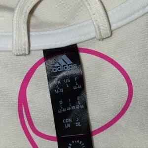 women's jacket / thin & lightweight / by Adidas / cream colored jacket with white stripes and floral pattern around logo on front and back / has full zipper and pockets / excellent condition