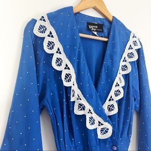 Vintage dress in cerulean blue featuring white polka dot motif. Surplice neckline with white lace trim, elasticized waist, and pockets at hips. 3/4 length sleeves, double buttoned closure at waist. Unlined, midi length A-line silhouette.