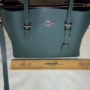 Chic Coach satchel in dark green leather. Features dual handles and detachable strap. Perfect for versatile styling.