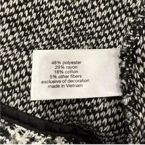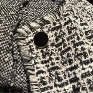 Sophisticated textured blazer with a classic black and white pattern. Features a stylish frayed edge and button closure. Perfect for both professional and casual settings.