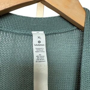 This Lululemon Athletica wrap sweater in size XL is designed for women and features a soft and cozy wrap design with elegant ribbed detailing. Made from a blend of viscose, nylon, acrylic, and cashmere, it offers a comfortable fit with long sleeves for added warmth. The solid green color and signature Lululemon logo detail make it suitable for casual occasions, especially during the fall season. The knit fabric requires hand washing. This item is pre-owned but in EXCELLENT condition!