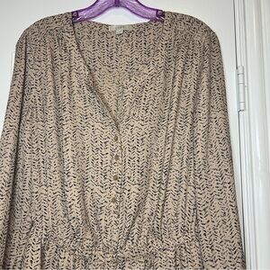 LOFT versatile shorts jumper in a tan and black abstract chevron print. Lightweight, elastic waistband. Side pockets, v-neck and button front. Long sleeves, roll up button option.