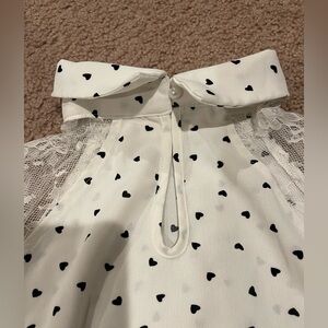 Women's Junior SHEIN lightweight black heart print Flat Collar with Mesh shoulder top, size XS, made of thin polyester material, slightly see-thru. No inner lining. Its brand new without tag (tag has been removed) NWOT. Never worn.