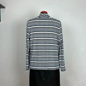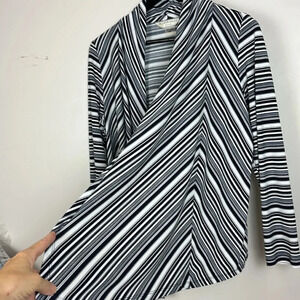 This is in between a jacket and a sweater. Medium weight 92% polyester, 8% spandex for a comfortable fit. It hangs beautifully, has a closure-free front and a slimming silhouette. I love the way the design and pattern lines create movement and are balanced with a simple color scheme. Like new condition.