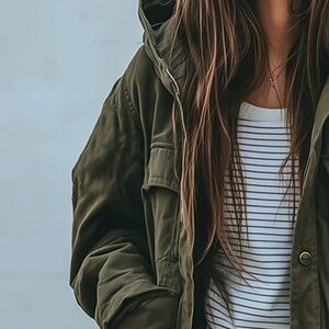 Stay stylish and warm with this olive green hooded jacket. Perfect for any casual outing.