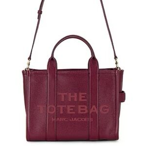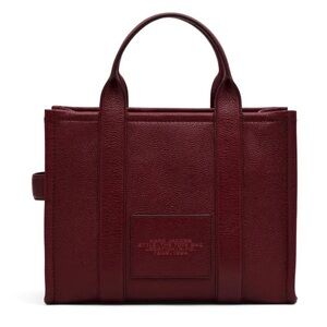 Elevate your style with this brand-new Marc Jacobs Leather Tote in Cherry/Gold. * Top handles, 4.33" drop * Adjustable removable crossbody strap, 27" drop * Dimensions: 10.24"W x 4.92"D x 8.27"H * Top zip closure * Interior slip pocket * Signature embossed front * Gold-tone hardware * Pebbled leather - Cherry gold