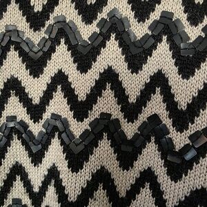 This vintage Susan Bristol cardigan sweater features a zigzag black and cream pattern with tiny black square sequins. It’s made of a lightweight wool blend (70% acrylic, 30% wool) and it has a zippered closure. Both comfortable and classy, it’s perfect for business casual days at the office, or weekend gatherings with friends.