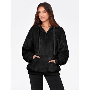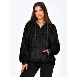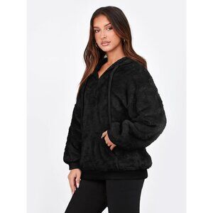 Women Black Oversized Fuzzy Fleece Zip up Hoodie Sweatshirt