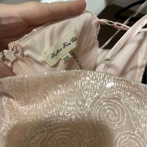 This elegant pink evening dress features delicate lace detailing and a flowing silhouette. Perfect for special occasions, it offers a sophisticated and feminine look.