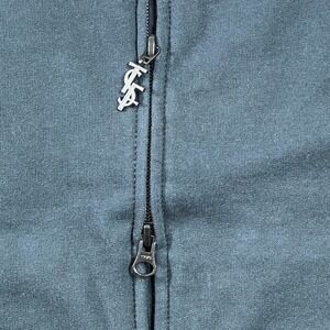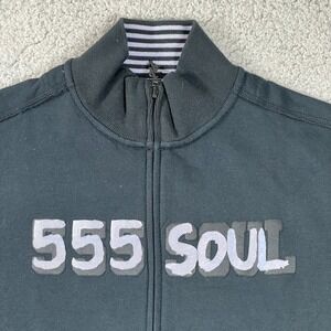 Keywords: Triple Five Soul, track jacket, full zip jacket, womens jacket, black jacket, striped collar, striped cuffs, athletic jacket, casual jacket, streetwear jacket, urban style, size large, cotton blend, dollar sign zipper pull, retro jacket