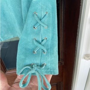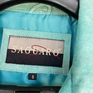 This Saguaro 💯 leather jacket is to die for!!! Perfect coastal cowgirl piece! Menthol blue/green color. Great pre owned condition!! Size small.