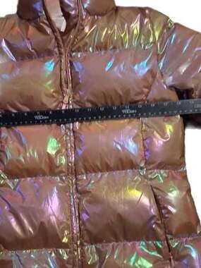 Fabletics Palmer Shine Puffer Jacket for women, featuring a stunning iridescent copper finish. This full-zip athletic puffer jacket combines style and warmth, perfect for active wear or casual outings. It boasts a unique reflective quality that shifts colors in the light, making it a standout piece. Made from 100% Recycled Polyester (body) and 100% Recycled Nylon (contrast), designed in California, and Made in China. Beautiful condition! Ready to wash and wear!