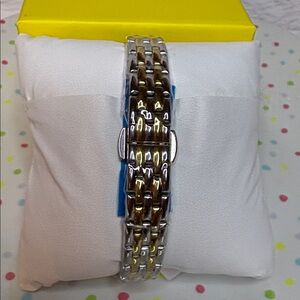 Stylish Invicta watch with a black dial and gold bracelet. Features sparkling crystal embellishments.
