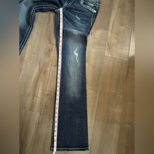 NEW Miss Me Signature Boot Cut Jeans Women 27 Denim Flap Pocket Beading Sequin. These jeans from Miss Me are brand new without tags. They are a 27 inch waist and 34 inch inseam in color MK 492. These are the signature boot cut jeans style number JP72568. These jeans have the leather back patch with clear sequins on it. The pockets are the envelope flap style pockets. The pockets also have silver buttons, rhinestones, thick stitching, sequins, and tube beading. There is intentional distressing on these jeans. These are great for concerts, western wear, Y2K styling, and rock and roll styles. Measurements are shown in the photos.