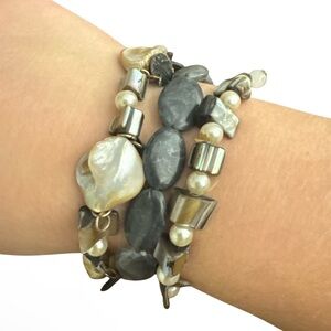 Enhance your style with this elegant multi-color beaded bracelet set. Featuring a blend of silver, gray, and cream beads, this accessory adds a touch of sophistication to any outfit.