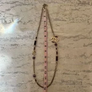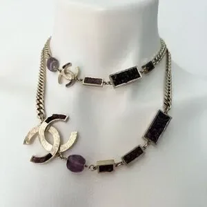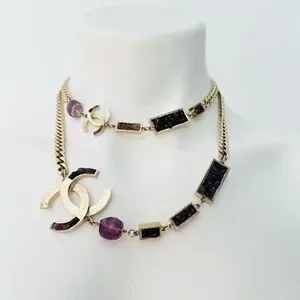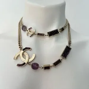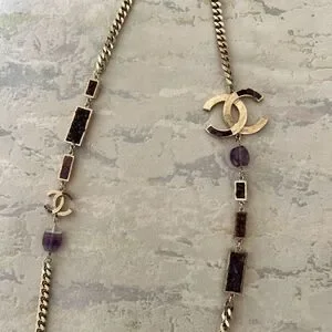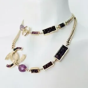 classic interlocking C’s on gold tone metal curb link chain with purple amethyst accents, long adjustable chain can be worn double as a choker or long single necklace.