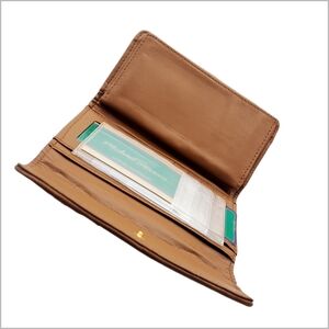This envelope style wallet has a snap closure. There are many pockets on the inside and a place for your checkbook. It has a zipper pocket on the outside. It is signed on the snap closure.