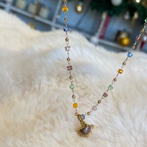 This elegant necklace features a stunning array of multicolored beads, beautifully complemented by a gold pendant. Perfect for adding a touch of sophistication to any outfit.