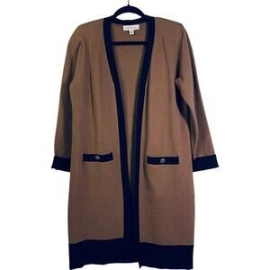 PHILOSOPHY Cardigan Open Front Long Line Knit Pockets Black Trim Gold Hardware