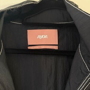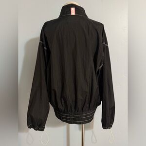 Trendy black windbreaker jacket paired with matching shorts. Features a high collar and relaxed fit. Waterproof material.