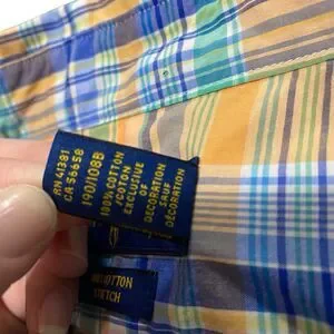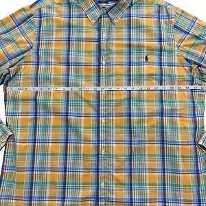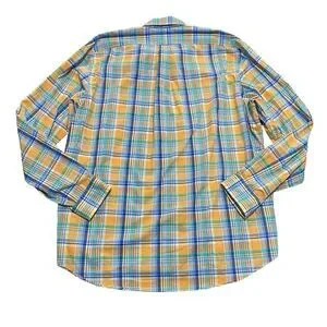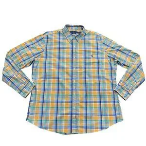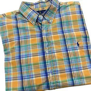 This is a Ralph Lauren button down, front pocket shirt, perfect for any occasion. Made from 100% cotton and featuring a classic fit, this shirt is machine washable and has long sleeves with buttoned cuffs. The collared neckline and button-down closure add a touch of sophistication, while the multicolor plaid pattern and woven fabric type give it a classic and preppy feel.