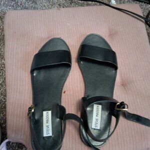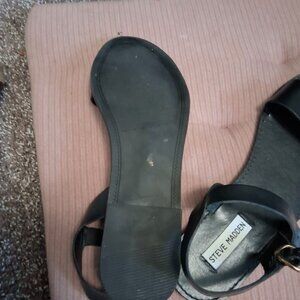 Sleek and versatile Steve Madden flat sandals in black leather. an adjustable ankle strap for a perfect fit. The stacked wood-look mini heel adds a touch of contrast. Great for summer, vacations, or a casual office look!