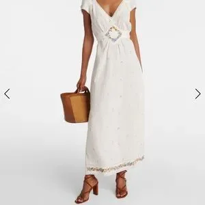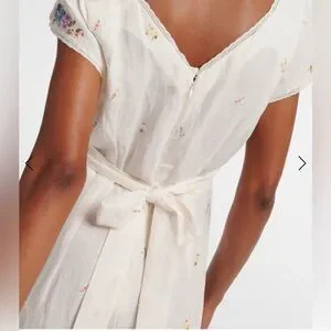 Elegant cream dress with colorful floral embroidery. Features a V-neckline and cap sleeves. Perfect for a chic, feminine look.