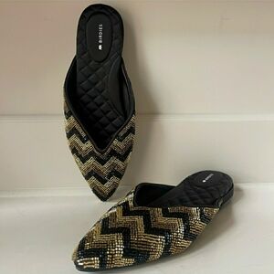 Birdies The Swan Beaded Art Deco Chevron Mule Flat in Black & Gold NEW Size 10.5