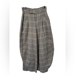 Soft cotton fabrication, plaid print, pockets for hands, welt pockets at back, barrel-style legs with darting, zip-fly