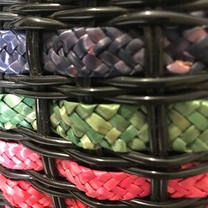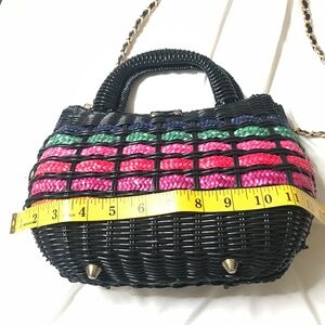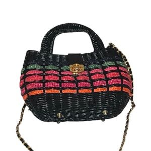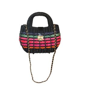Unique vintage-style woven mini handbag featuring colorful horizontal striping in red, green, and orange on a black base. Structured silhouette with a top handle and removable/adjustable gold-tone chain strap for shoulder or crossbody wear. Finished with a gold turn-lock style closure. Perfect statement piece for evenings, festivals, or adding a pop of color to any outfit.