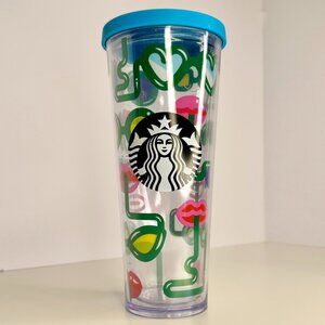 2014 STARBUCKS 24 OZ HEART LIPS GLASSES TUMBLER COLD CUP VENTI Blue Lid