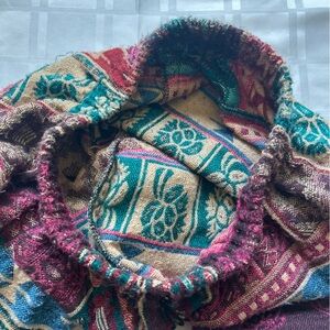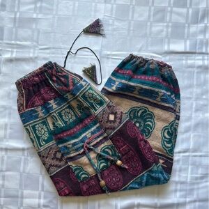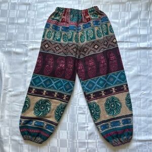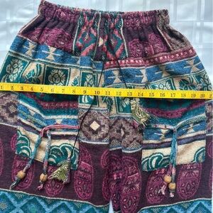 Multi-print pants, in good condition - wash wear and piling. Elastic waist with loose fit legs and tapered ankle, tasseled drawstring, wood bead detail on patch pockets. No tags, see measurements.
